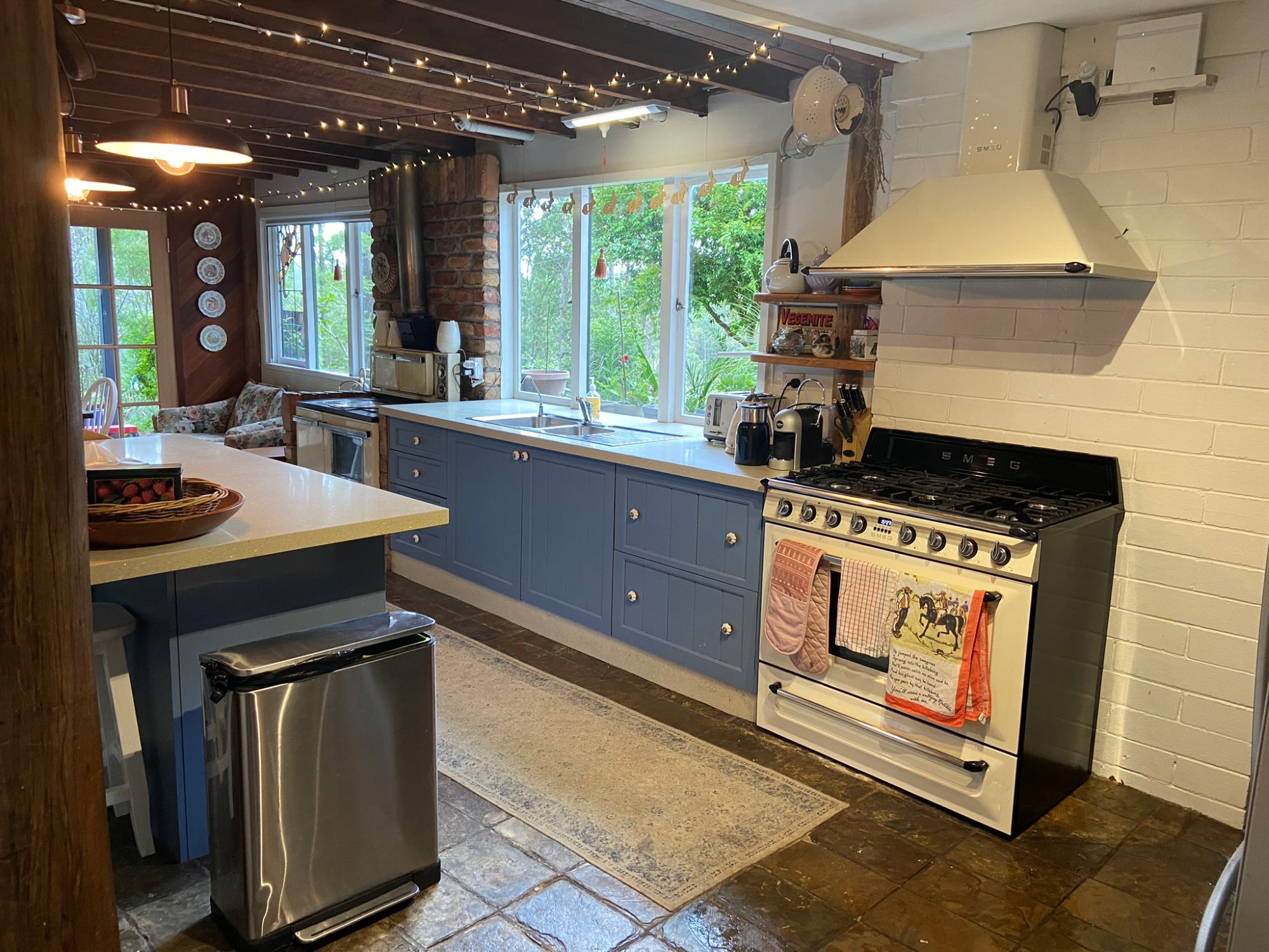 Downstairs, you’ll find the main bathroom, open-plan kitchen and dining area, separate living room, featuring reverse cycle air conditioning and a wood fire heater for year-round comfort.